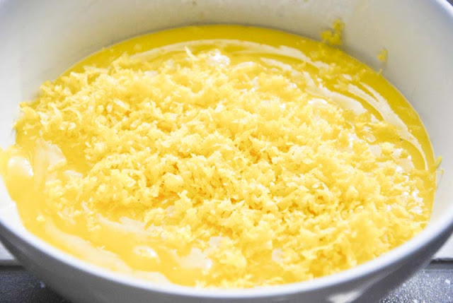 Riv av skallet på et fint rivjern og press saften ut av sitronene. Tilsett kun saften i kjelen og varm opp på middels varme
